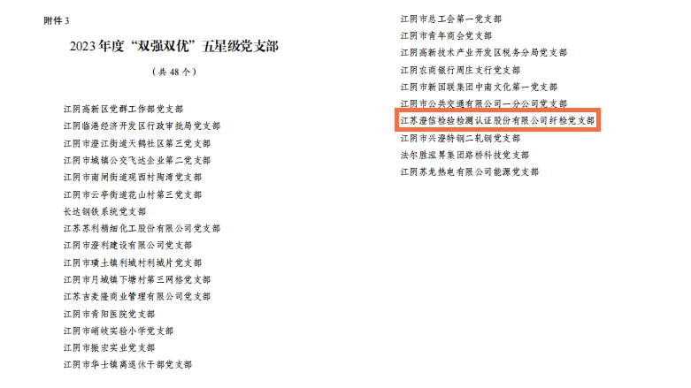 近日,中共江陰市委組織部通報了全市2023年度基層黨建“十佳書記項目”“優秀書記項目”“雙強雙優”五星級黨支部評定結果,江蘇澄信檢驗檢測認證股份有限公司纖檢黨支部獲評“雙強雙優”五星級黨支部。江蘇澄信